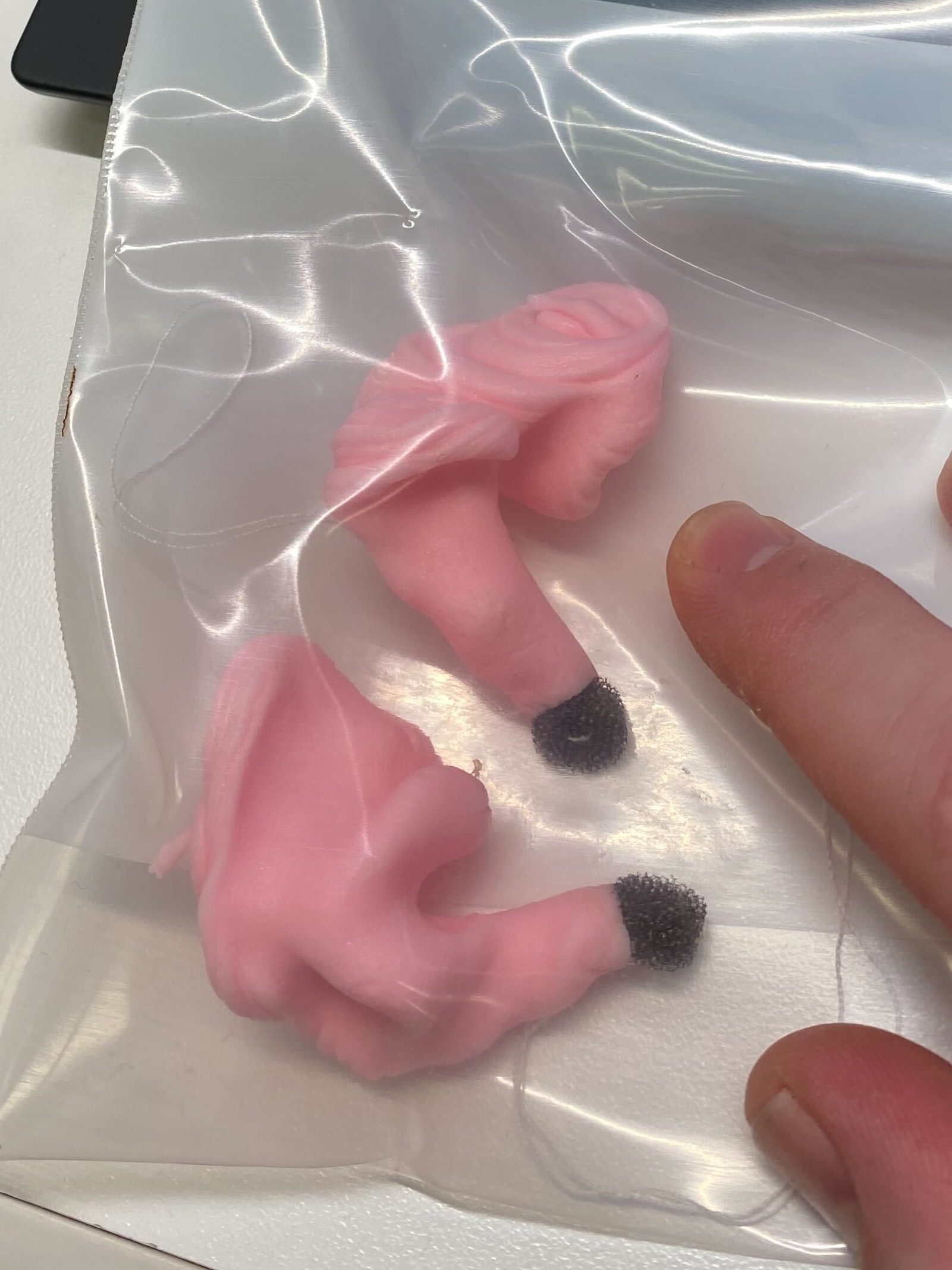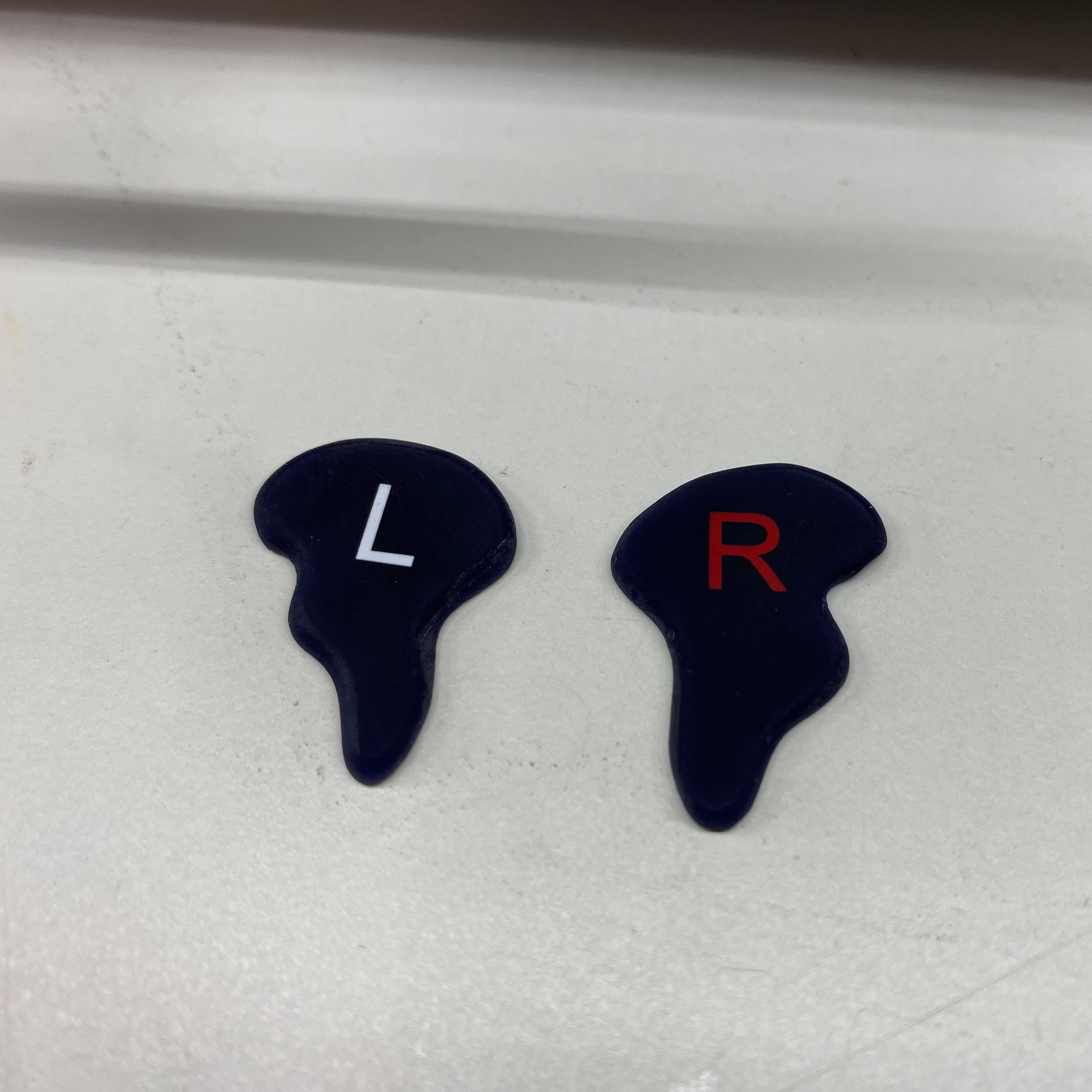 I printed the top caps at the same time that I printed the shells. I figured that I might as well try something fancy so I put the top caps on my laser engraver and I engraved in an “L” for the left ear and an “R” for the right ear. I then filled these letters with white and red UV cure nail polish, cured the polish in the 365nm uv curing oven that I had purchased as part of this project, and sanded off the extra nail polish to reveal a nice looking set of top caps.